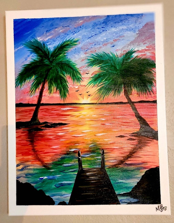 20x16 Tropical Sunset Acrylic Painting Dock View Palm Tree Etsy De